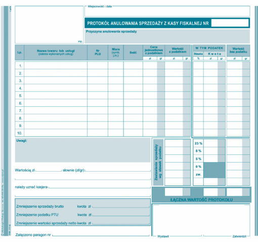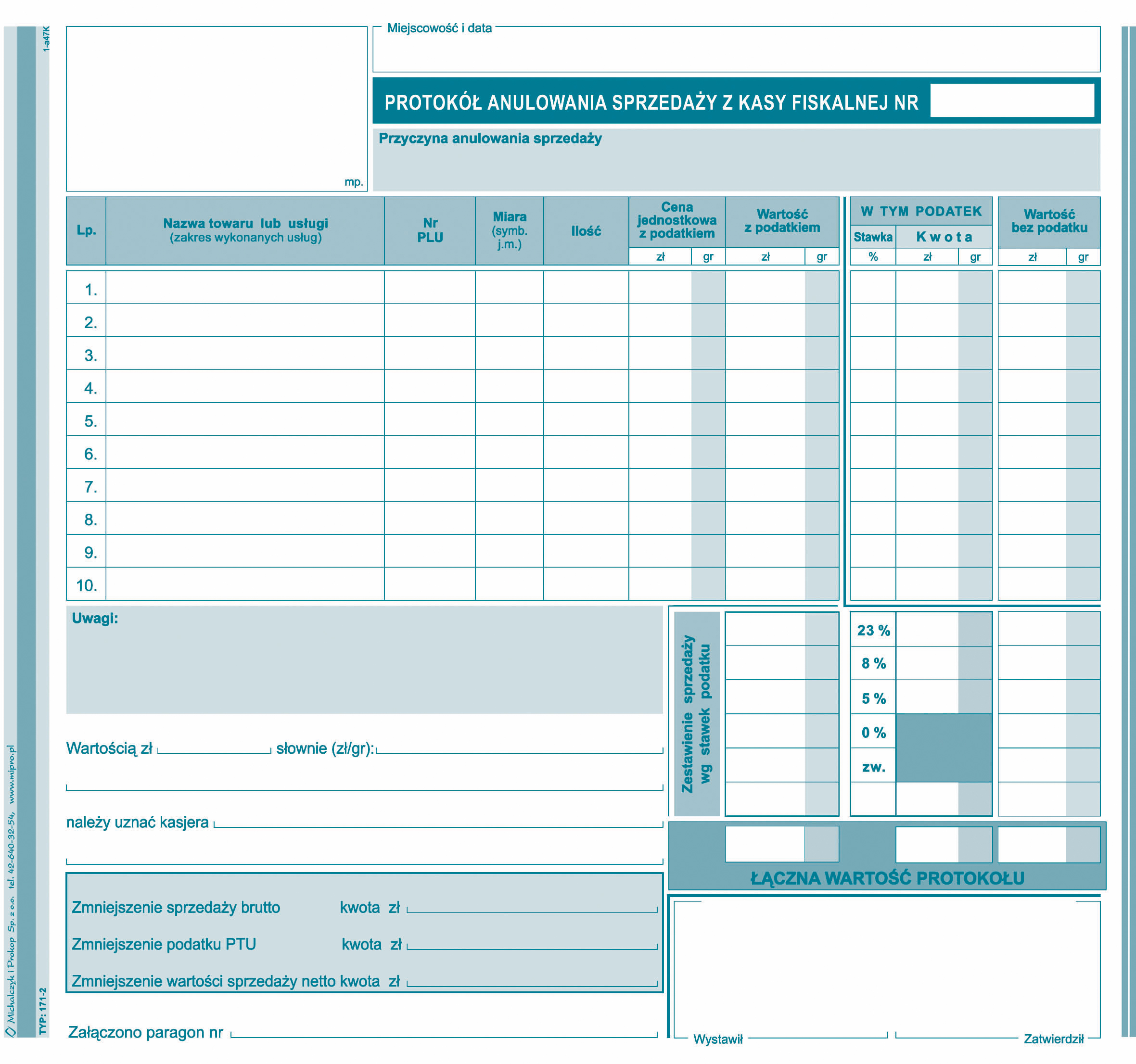 171-2 Protokół anulowania sprzedaży z kasy fiskalnej 171-2