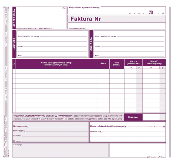 zastosowanie: | faktury i inne dokumenty wynikające z przepisów o podatku od towarów i usług |