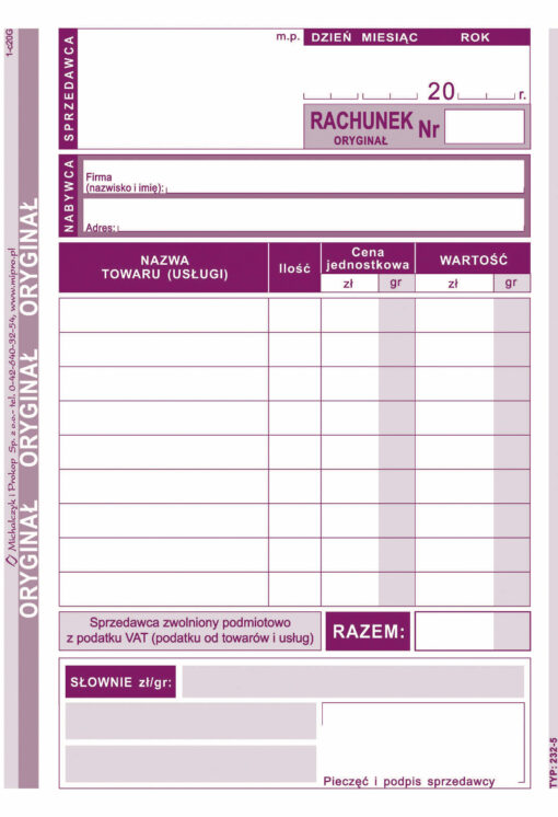 232-5 Rachunek dla zwolnionych podmiotowo z VAT 232-5