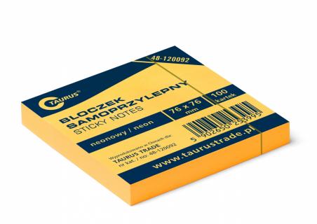 Bloczek samoprzylepny Taurus, 76x76mm, 1×100 kart.,neon pomarańczowy