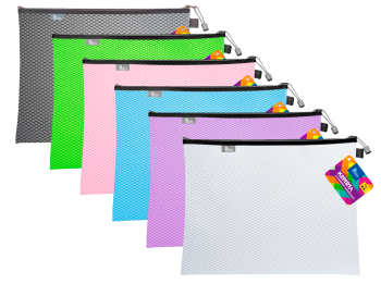 Koperta z suwakiem metalowym, mieszcząca format A4. Miękkie i elastyczne tworzywo. Wymiary koperty: 360×270 mm, grubość: 0,5 mm. Opakowanie: folia 1 sztuka