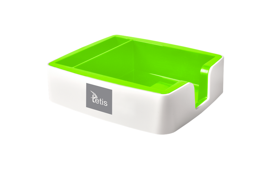Wykonany z tworzywa sztucznego organizer. Antypoślizgowa podstawa. Pojemność wizytówek: 50 sztuk. Pojemność karteczek: 200 sztuk. Maksymalny rozmiar karteczek: 90×90 mm